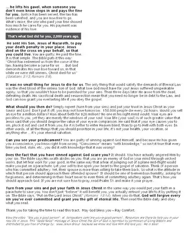With EDDM, larger can be better and does not cost additional for the USPS to deliver it. This is a new concept that developed after taking LivingWaters.com evangelism course and using their "Are you good enough to go to heaven" tract for walk out door to door distribution. This tract covers most all the insights of Ray Comfort's many years of street evangelism. It leads them into the knowledge of the severity of their sin diseased condition before God so they can appreciate and receive the "Good News" cure.