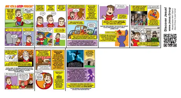 You are welcome to use the "Are You Good Enough to go to Heaven" cover design as I created that myself from a vector image on Pixabay.com. You can download your own free copy of the sunrise background image from Pixabay.com. The comic cartoon content is licensed and belongs to LivingWaters.com where it is provided free of charge per their website information and download. See "Are you a good person?" tract. You can contact me for the completed print ready artwork and just replace the QR's and other info content with your own.