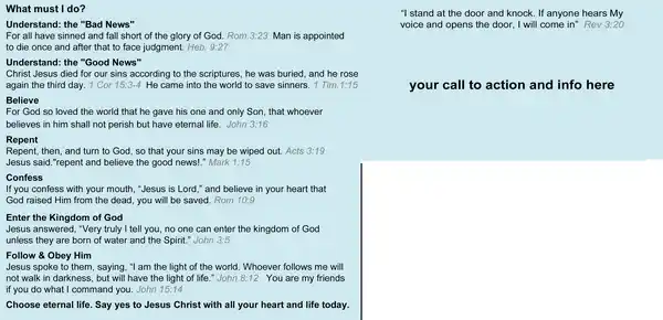You are welcome to use the cover design as I created that myself from a vector image on Pixabay.com. Be sure to download your own free copy. BUT ... the text content is licensed and belongs to LivingWaters.com so you will need to contact them and get a written release to reprint their content should you seek to do that. You can see the amount of space you have for content so the possibilities are endless for your own content creation.
